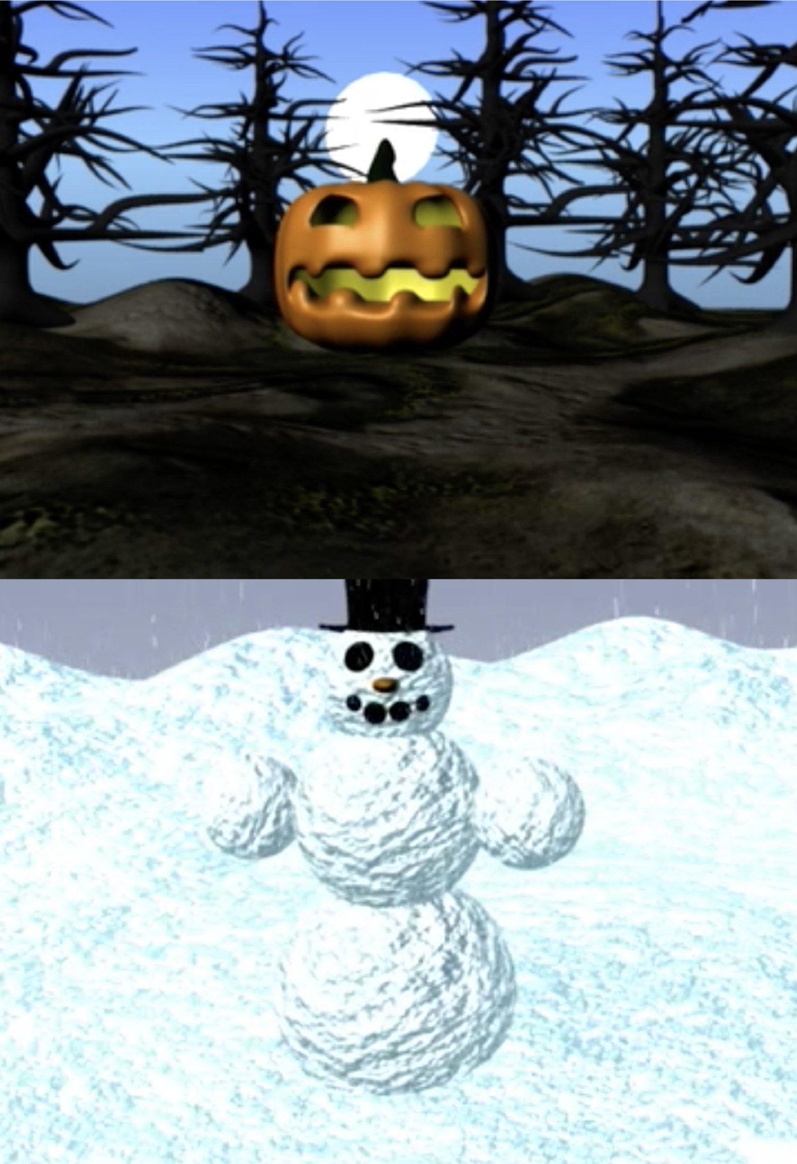 Animations Click on the pictures above and to the right to view animations. Quick animations of a snowman waking up and waving at his audience, and a spooky jack-o-lantern wishing everyone a “Happy Halloween!”. Related